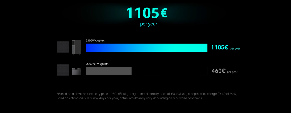 Kann man Strom nicht allein in einem PV-System speichern? Ersetzen Sie Ihren Mikroinverter mit Jupiter! Es unterstützt nicht nur 800W an Netzleistung, es kann auch 2560Wh / 5120Wh an Strom speichern, um den Druck auf den Stromverbrauch während der Spitzenzeiten in der Nacht zu erleichtern.