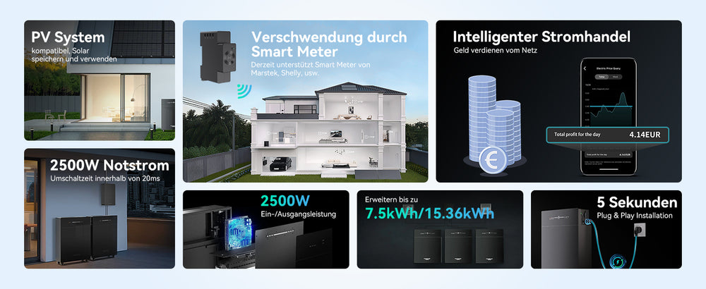 Wenn Strom im Netz ist, kann MARSTEK VENUS C / E Geld bei Strom sparen, indem es Strom speichert, wenn die Preise niedrig sind, und es entlädt, wenn die Preise hoch sind, oder durch Aufladen tagsüber über die Solarpanelen und Entladen nachts. Wenn das Netz ausgeschaltet ist, kann MARSTEK VENUS C/E immer noch von den Solarpanelen aufgeladen werden und als Ersatzstromquelle zur Stromversorgung wichtiger Geräte verwendet werden.